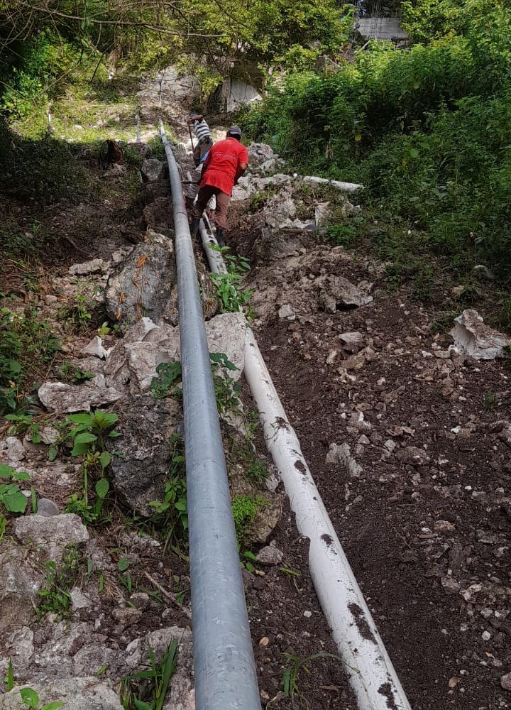 El personal de fontanería de la Dirección de Servicios Públicos Municipales de San Andrés, Petén. Continúa trabajando en la reparación y mantenimiento de una de las tuberías principales de captación, que abastece los tanques de agua.