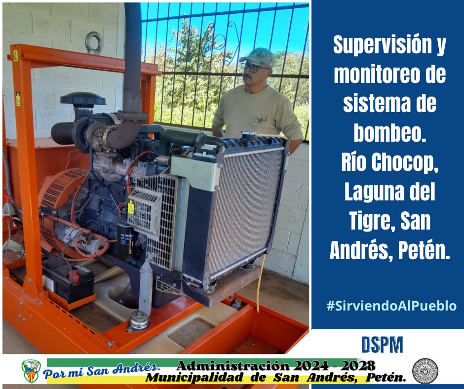 La Dirección de Servicios Públicos Municipales DSPM de San Andrés, Petén. Realiza trabajos de supervisión y monitoreo de sistema de bombeo y calidad del servicio del agua en Río Chocop, Laguna del Tigre, San Andrés, Petén.