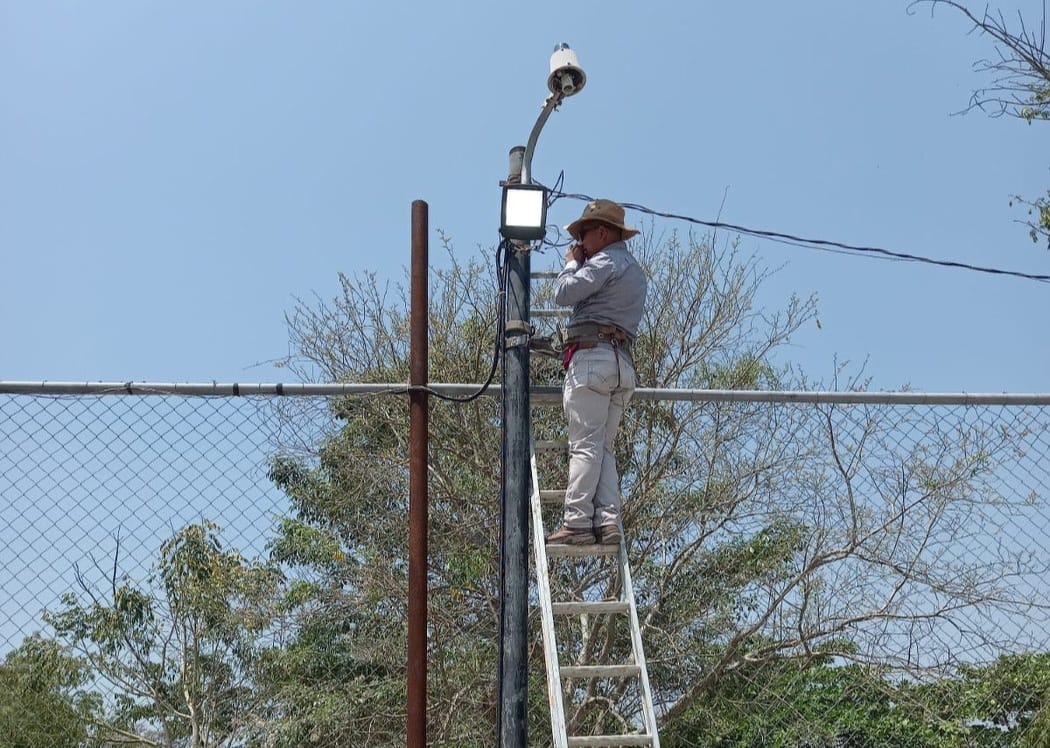 La Dirección de Servicios Públicos Municipales DSPM de San Andrés Petén. Con el equipo de electricistas municipales realiza trabajo de instalación de reflectores en cancha de basquetbol de Bo. El Centro. Sacpuy San Andrés, Petén.