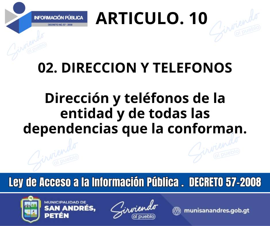 Dirección y teléfonos de la entidad y de todas las dependencias que la conforman. Del articulo 10 de la Ley de Acceso a la Información Pública. DECRETO 57-2008.