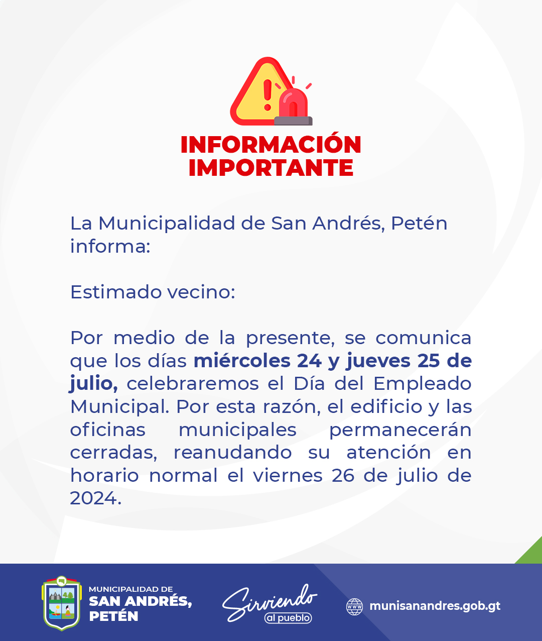Por medio de la presente, se comunica que los días miércoles 24 y jueves 25 de julio, celebraremos el Día del Empleado Municipal. Por esta razón, el edificio y las oficinas municipales permanecerán cerradas, reanudando su atención en horario normal el viernes 26 de julio de 2024.