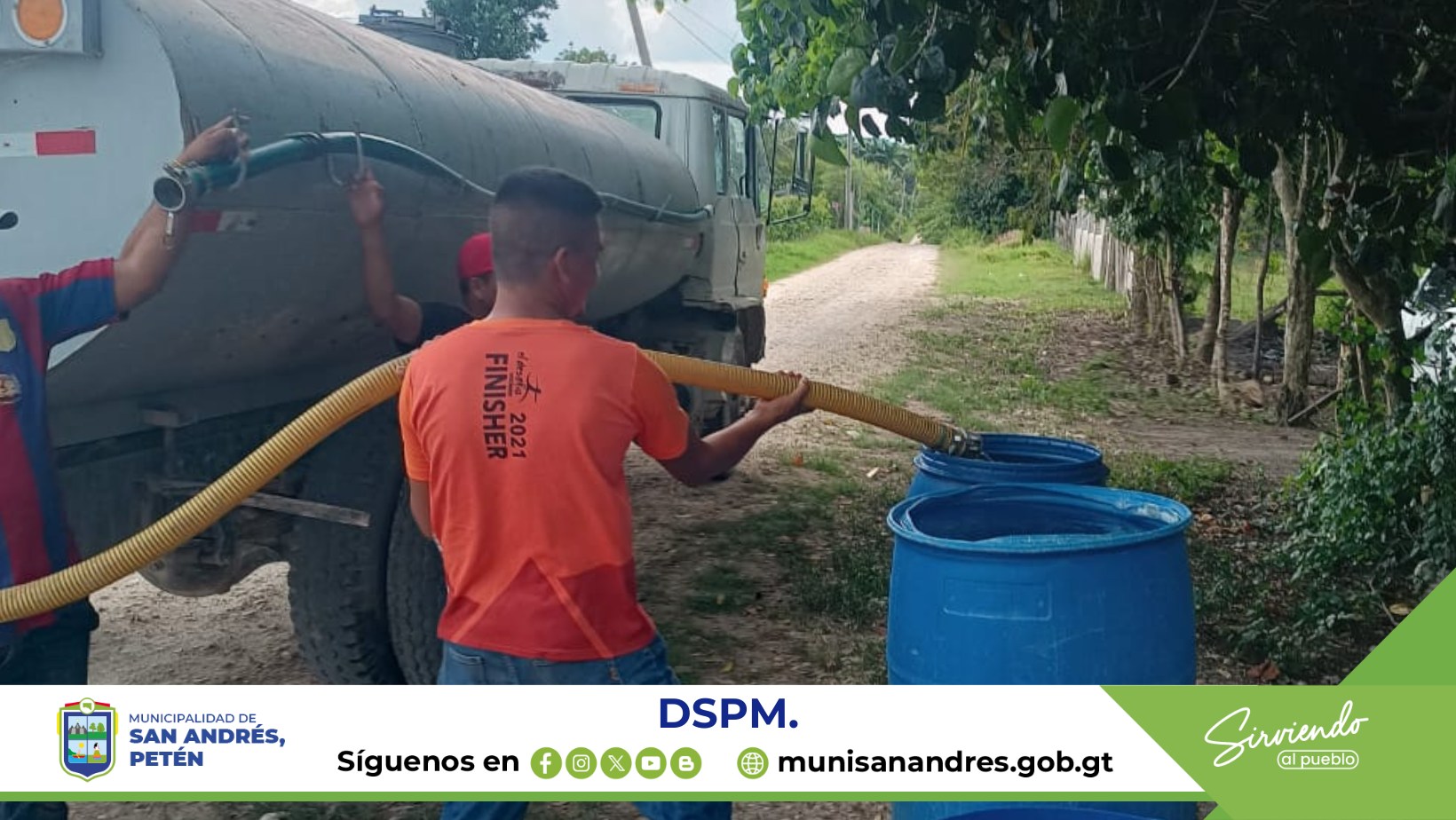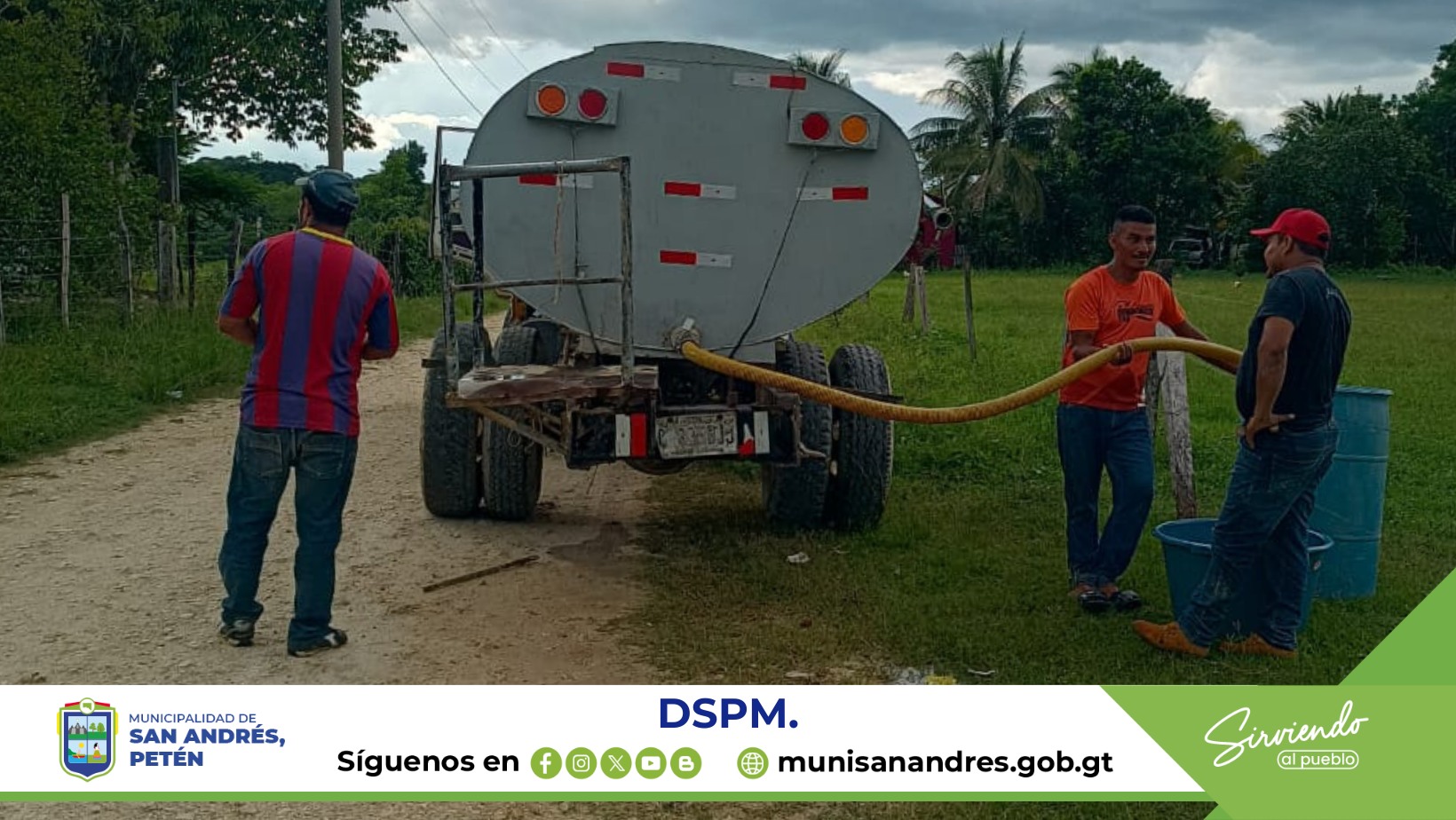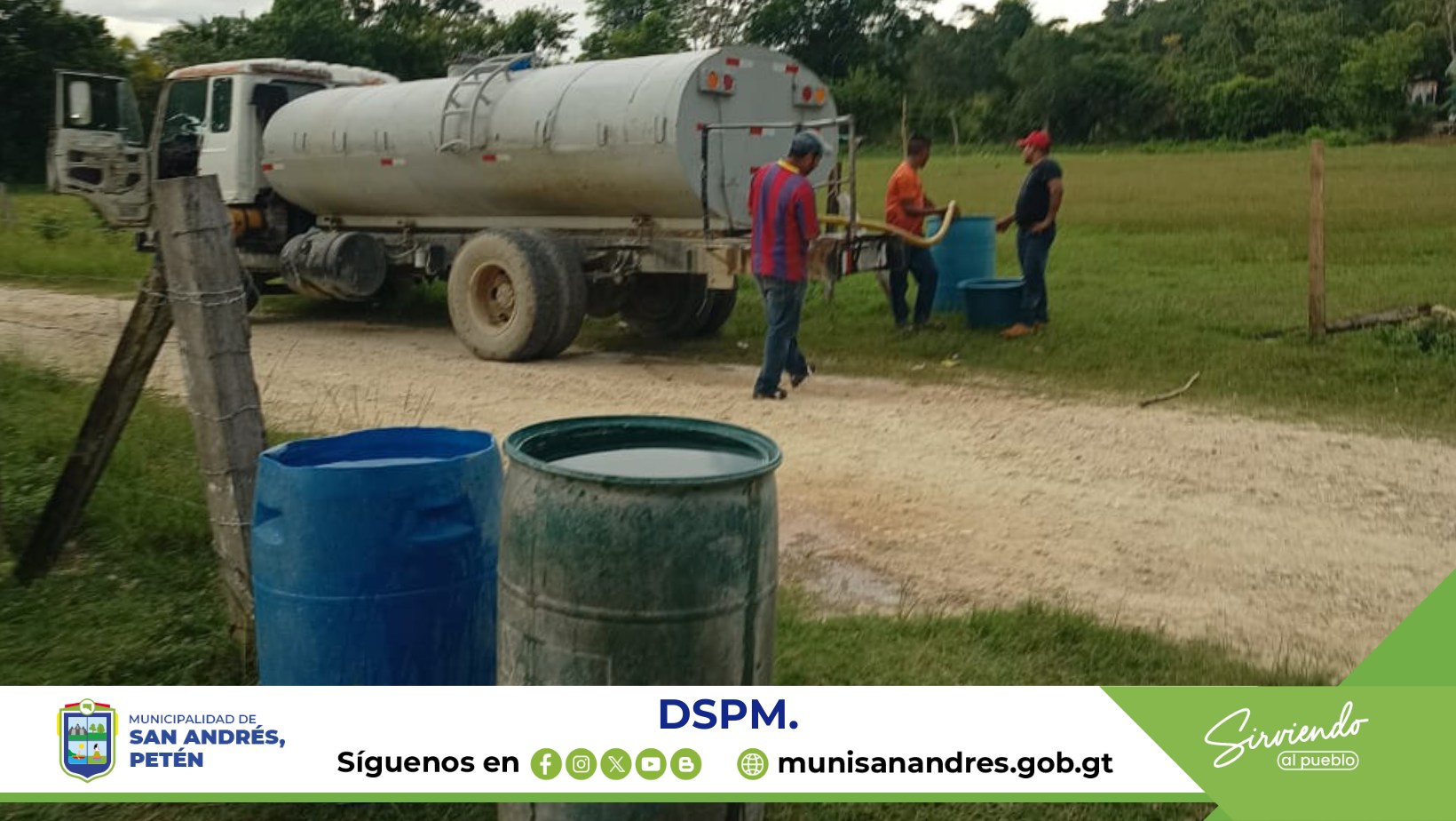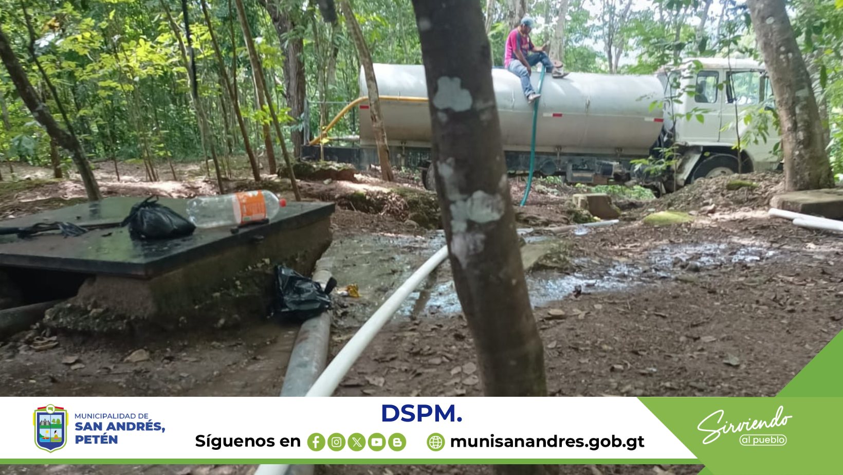 Debido a ello el Lic. Jonne Méndez Bardales. Alcalde municipal de San Andrés, Petén. Gestiona y coordina con La Dirección de Servicios Públicos Municipales DSPM Realizar trabajos de abastecimiento de agua por medio de pipa, mientras se realizan las reparaciones correspondientes al equipo de bombeo dañado.