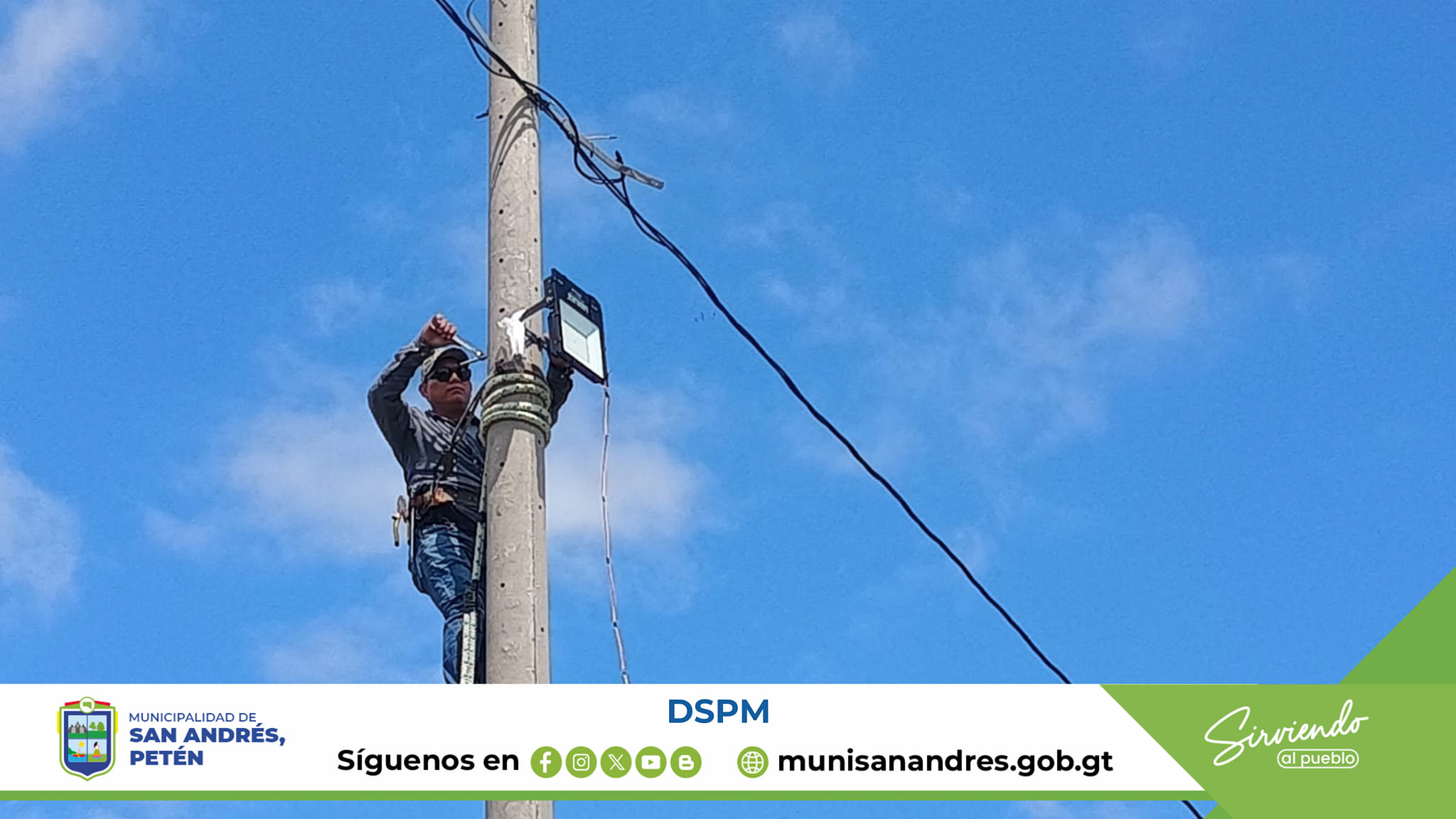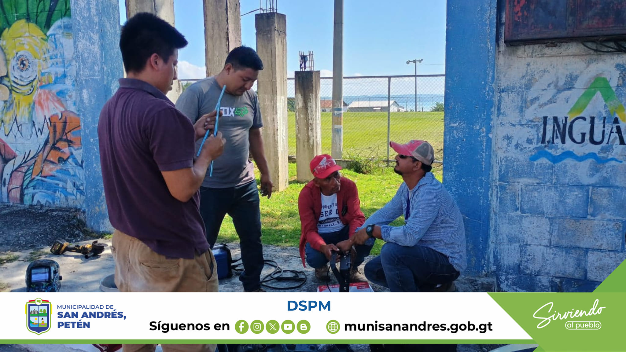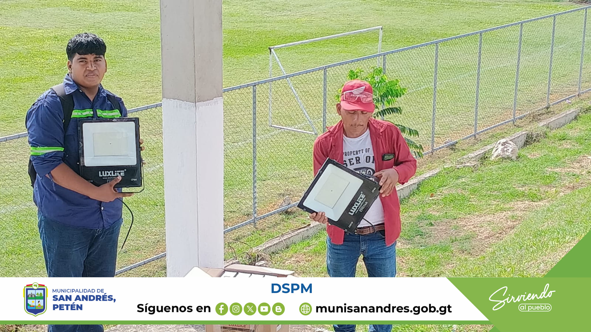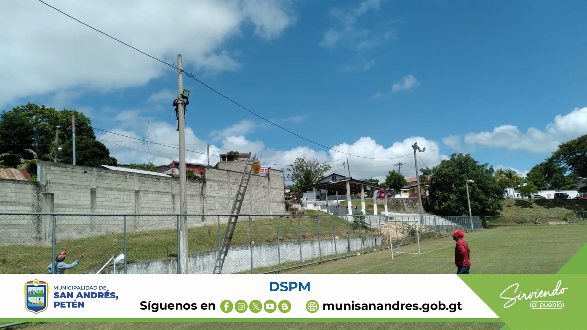 La Dirección de Servicios Públicos Municipales DSPM de San Andrés, Petén, está llevando a cabo la instalación de reflectores en el campo de fútbol del Barrio el Centro Abelardo Chatá de San Andrés, Petén. Esta acción tiene como finalidad mejorar la iluminación del área, permitiendo que las actividades deportivas y recreativas pueden realizarse en horarios nocturnos de manera segura.