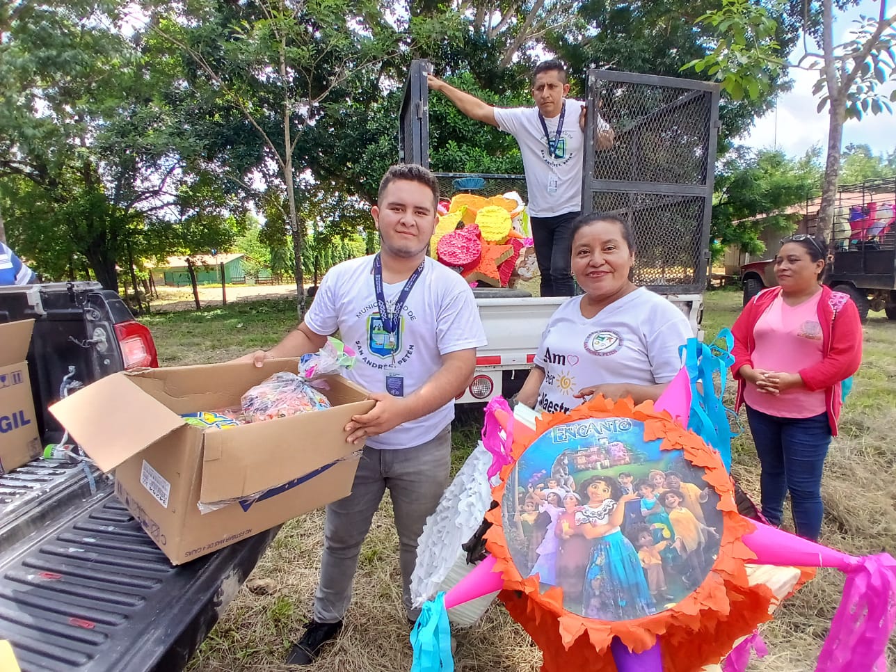 Es así como el equipo municipal de manera coordinada hizo entrega de piñatas y dulces en el tiempo programado en las diferentes escuelas del nivel primario y preprimario del municipio de San Andrés, Petén. Con el objetivo de de la conmemoración y celebración de los 203 años de vida independiente de nuestra patria Guatemala. En este 15 de septiembre.