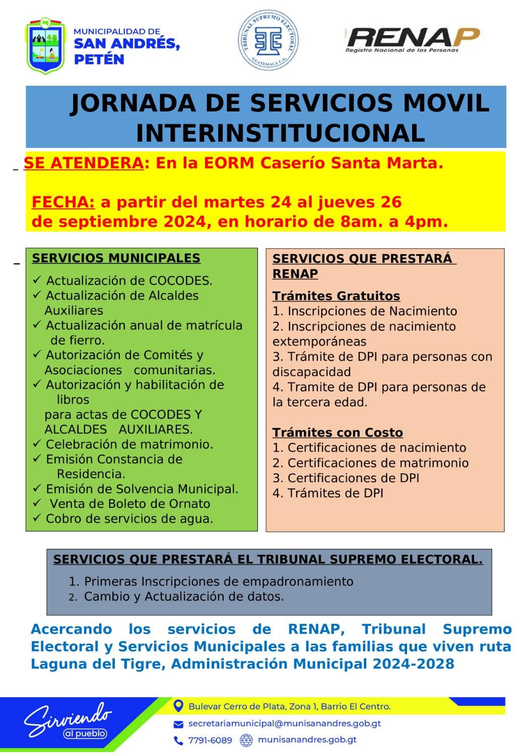 JORNADA DE SERVICIO MÓVIL INTERINSTITUCIONAL. Caserío Santa Marta, San Andrés, Petén. Publicado por WEBMASTER | Sep 18, 2024 | Fortalecimiento Institucional | 0 | A partir del martes 24 al 26 de septiembre 2024. De 08:00 AM a 16:00 PM Administración 2024 – 2024 2028 #SirviendoAlPueblo