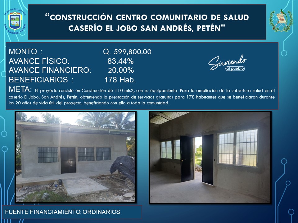 El Sr. Alcalde Lic. Jonne Méndez Bardales y Honorable concejo Municipal de San Andrés, Petén. Presentan avance del proyecto. CONSTRUCCIÓN CENTRO COMUNITARIO DE SALUD CASERÍO EL JOBO SAN ANDRÉS, PETÉN este consiste en Construcción de 110 mts2, con su equipamiento. Para la ampliación de la cobertura salud en el caserío El Jobo, San Andrés, Petén, obteniendo la prestación de servicios gratuitos para 178 habitantes que se beneficiaran durante los 20 años de vida útil del proyecto, beneficiando con ello a toda la comunidad.