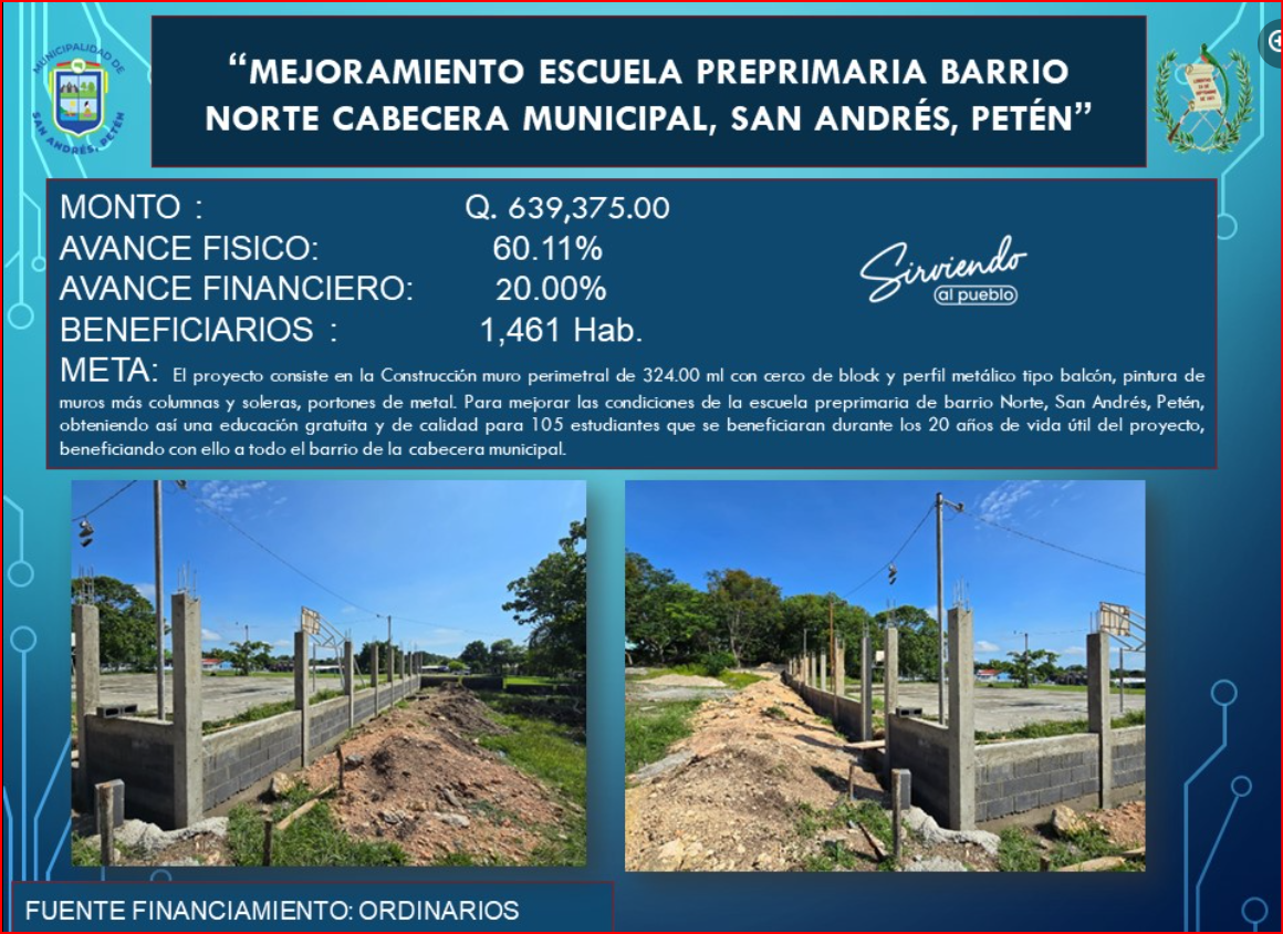 El proyecto consiste en la Construcción muro perimetral de 324.00 ml con cerco de block y perfil metálico tipo balcón, pintura de muros más columnas y soleras, portones de metal. Para mejorar las condiciones de la escuela preprimaria de barrio Norte, San Andrés, Petén, obteniendo así una educación gratuita y de calidad para 105 estudiantes que se beneficiaran durante los 20 años de vida útil del proyecto, beneficiando con ello a todo el barrio de la cabecera municipal.
