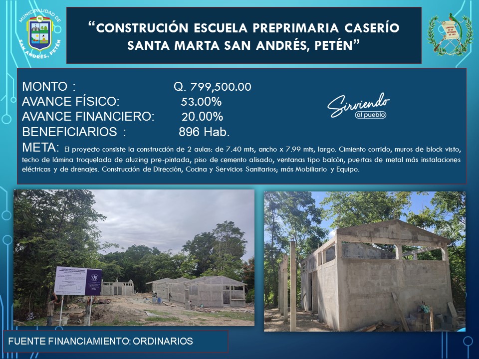 El Lic. Jonne Méndez Bardales. Alcalde municipal de San andrés, Petén. Presenta el informe de avances del proyecto. CONSTRUCIÓN ESCUELA PREPRIMARIA CASERÍO SANTA MARTA SAN ANDRÉS, PETÉN.