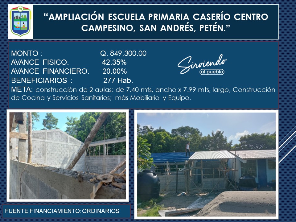 Se presenta el Informe de avances del proyecto de AMPLIACIÓN ESCUELA PRIMARIA CASERÍO CENTRO CAMPESINO, SAN ANDRÉS, PETÉN. que tiene como meta: construcción de 2 aulas: de 7.40 mts, ancho x 7.99 mts, largo, Construcción de Cocina y Servicios Sanitarios; más Mobiliario y Equipo, proyecto que se realiza con fondos ordinarios beneficiando a más de 277 habitantes.