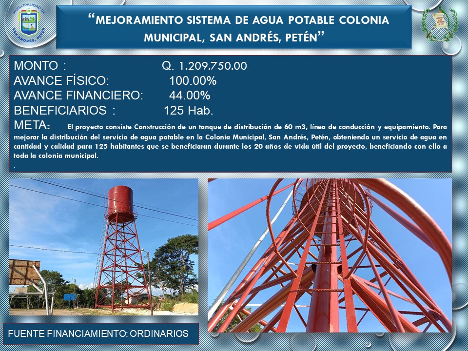 Informa de los avances alcanzados actualmente en el proyecto MEJORAMIENTO SISTEMA DE AGUA POTABLE COLONIA MUNICIPAL, SAN ANDRÉS, PETÉN que consiste en la Construcción de un tanque de distribución de 60 m3, línea de conducción y equipamiento. Para mejorar la distribución del servicio de agua potable en la Colonia Municipal, San Andrés, Petén.