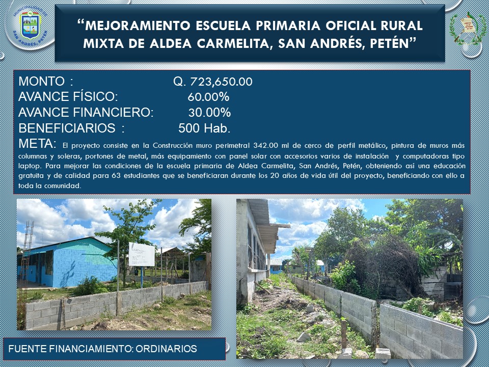 Este proyecto consiste en la construcción de muro perimetral 342.00 ml de cerco de perfil metálico, pintura de muros más columnas y soleras, portones de metal, más equipamiento con panel solar con accesorios varios de instalación y computadoras tipo laptop para mejorar las condiciones de la escuela primaria de Aldea Carmelita, San Andrés, Petén,