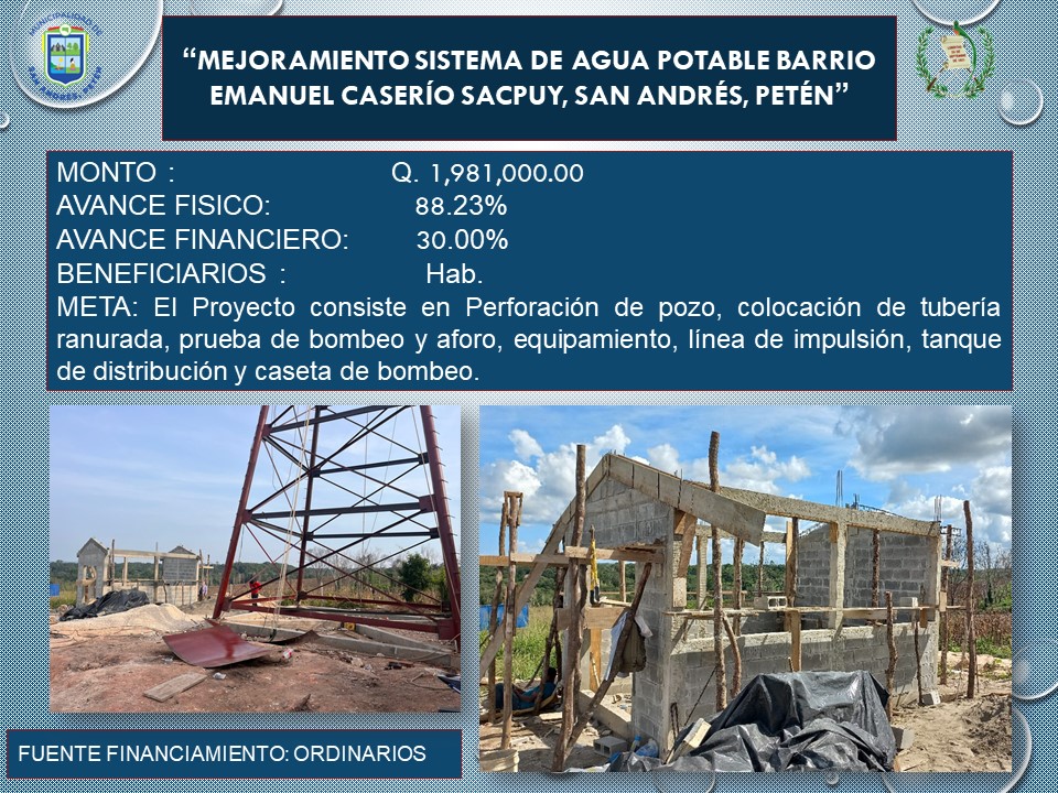 El agua es un líquido de vital importancia para la subsistencia humana. El MEJORAMIENTO SISTEMA DE AGUA POTABLE BARRIO EMANUEL CASERÍO SACPUY, SAN ANDRÉS, PETÉN Permitirá que la población en ese sector pueda tener un servicio de calidad, la actual administración dirigida por el Lic. jonne Méndez Bardales Alcalde municipal de San Andrés, Petén trabaja en ello, por lo que presenta informe de avances físico y financiero.