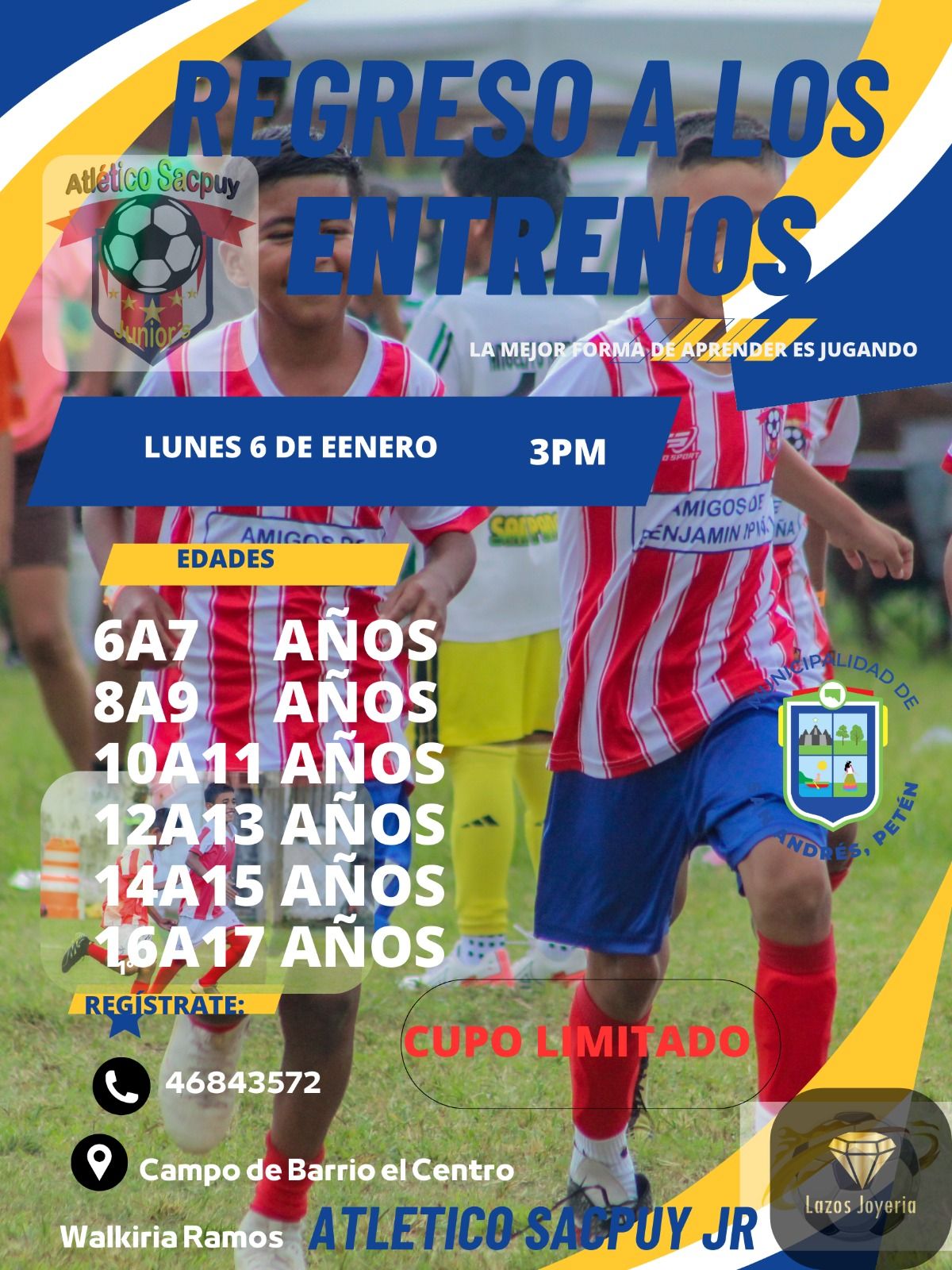 El Lic. Jonne Méndez Bardales Alcalde municipal de San Andrés, Petén invita a los niños que tengan deseos de formar parte del equipo de La Escuela de Formación Deportiva Atletico Sacpuy JR,