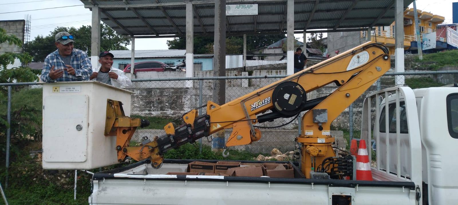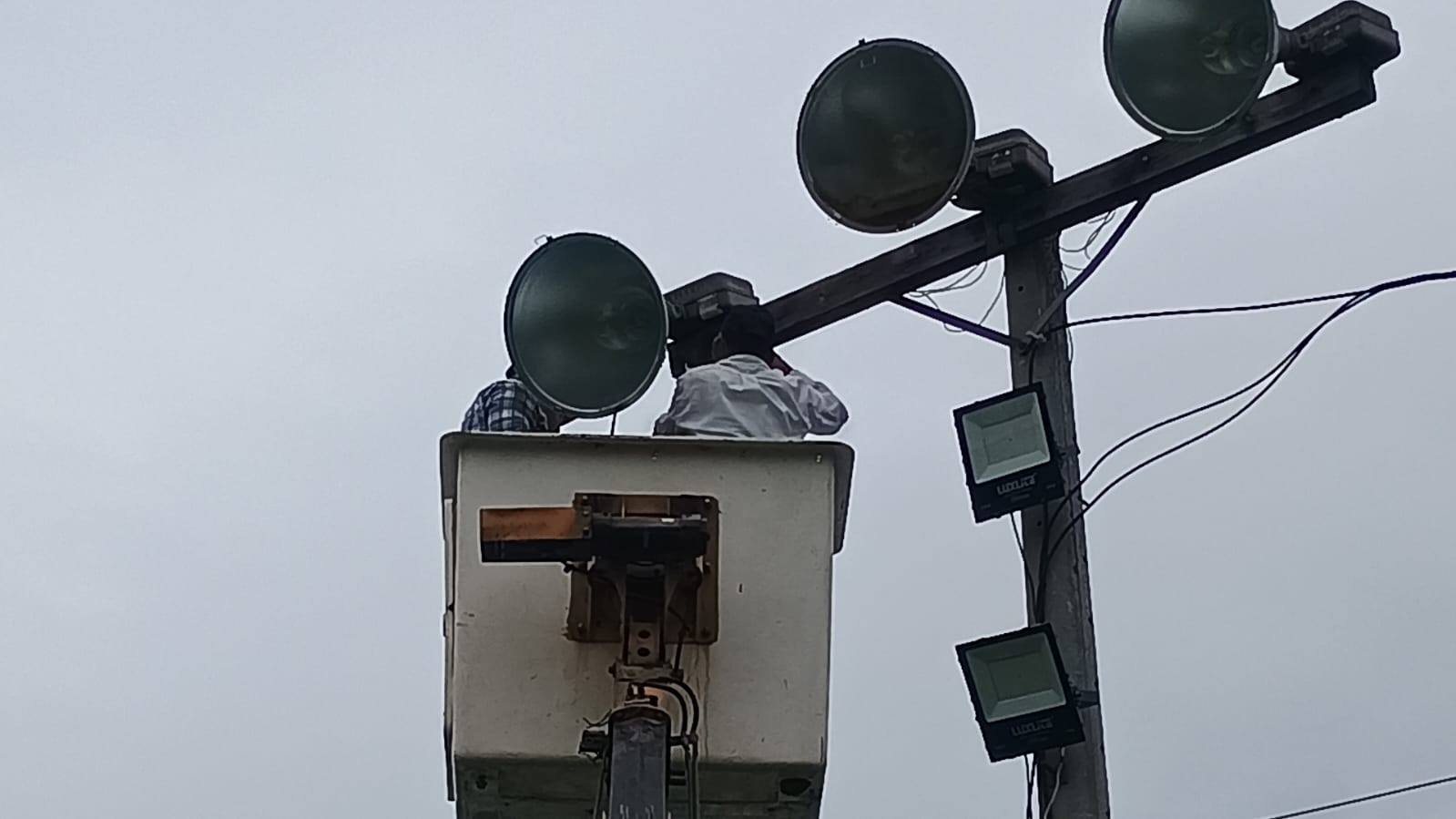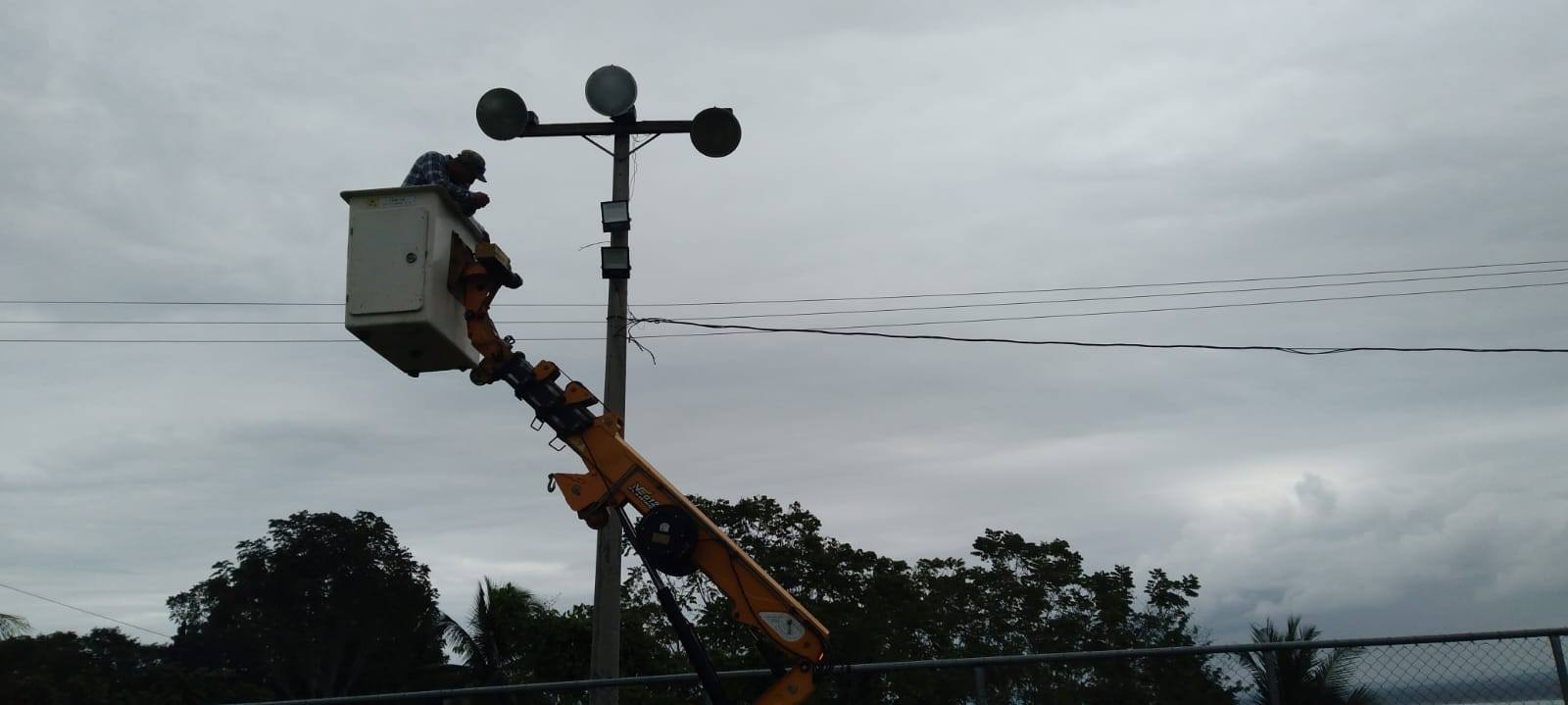Por instrucción de Lic. Jonne Méndez Bardales Alcalde municipal realizan trabajos de mejoras en la iluminación, colocando mejores luminarias en el campo de fútbol de Barrio EL Centro de la Cabecera municipal de San Andrés, Petén.