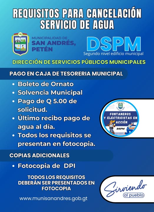 Pueden acercarse a la Dirección de servicios Públicos Municipales (DSPM) Segundo nivel del edificio municipal de San Andrés, Petén con los siguientes requisitos.