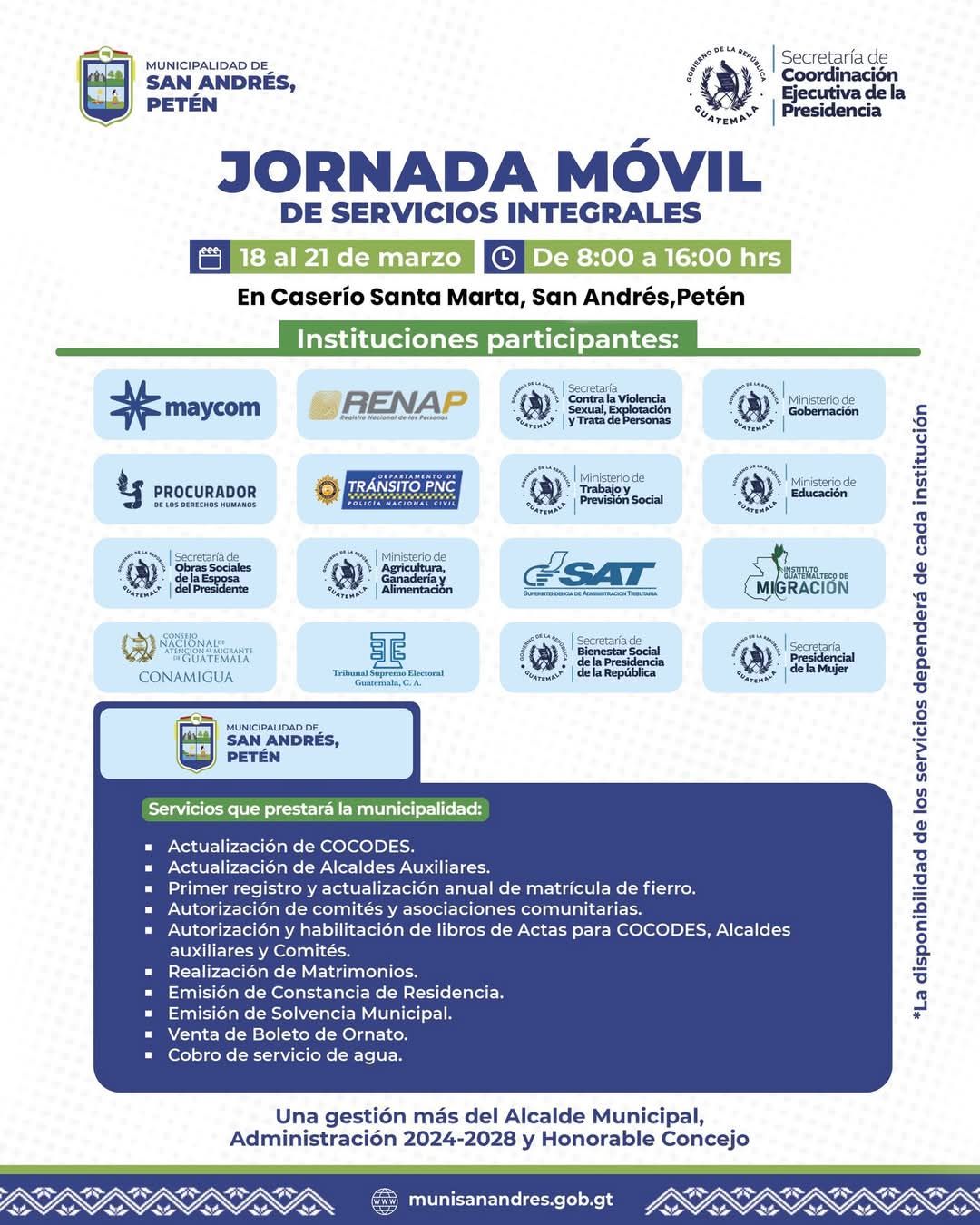Ya estás listo esté martes 18 de marzo inicia la Jornada Móvil de Servicios Integrales llegará a Caserío Santa Marta, San Andrés, Petén