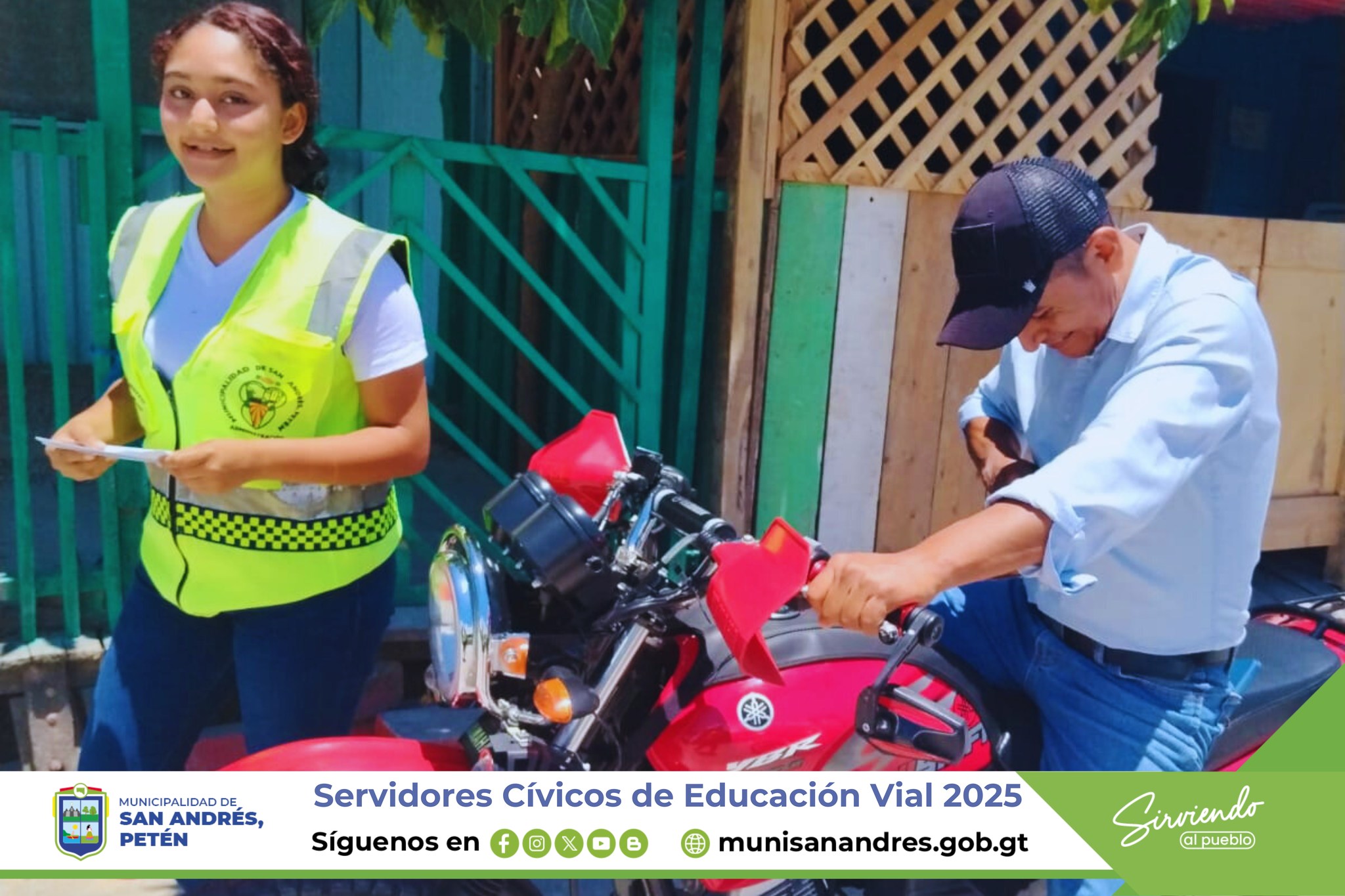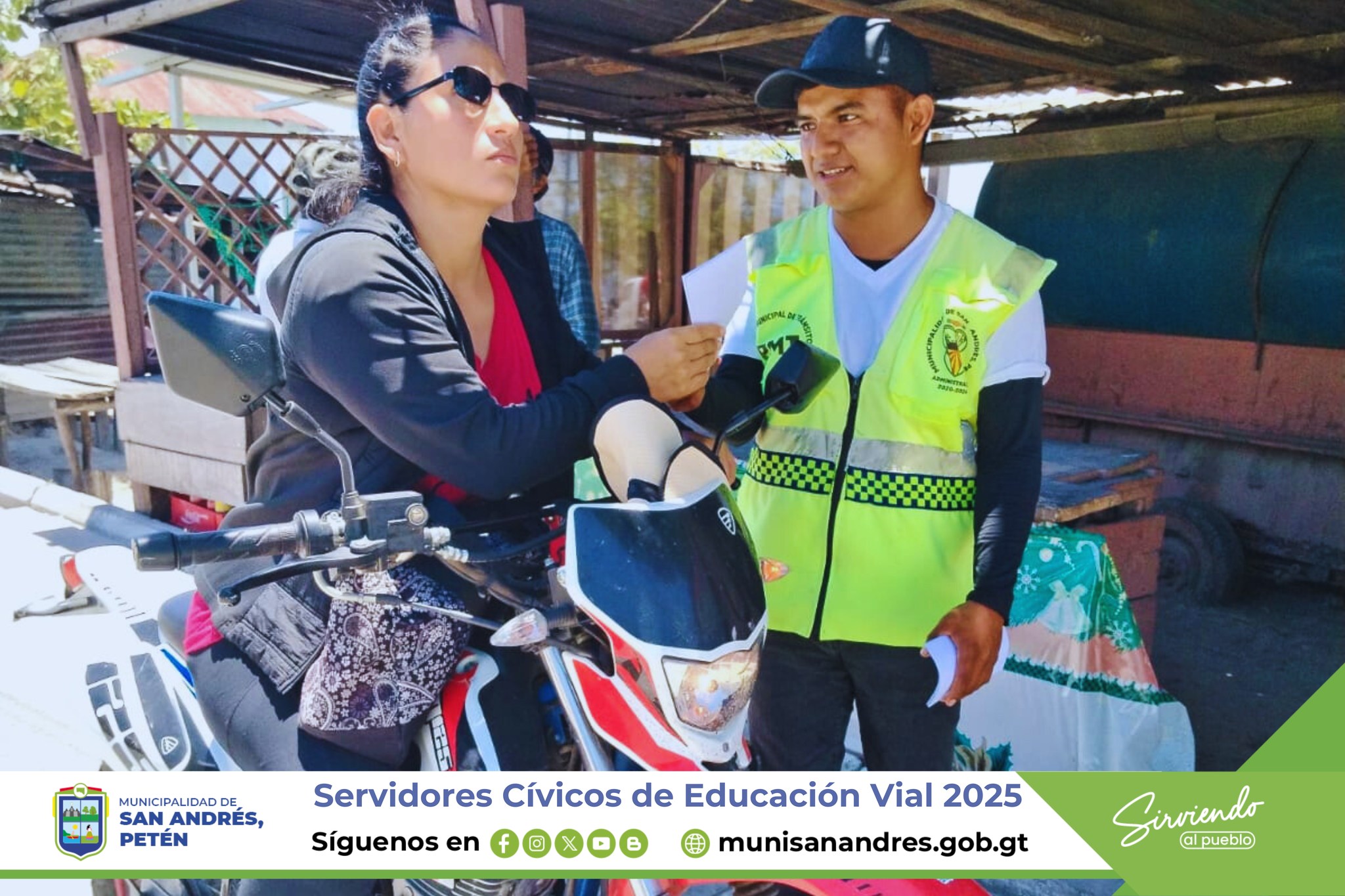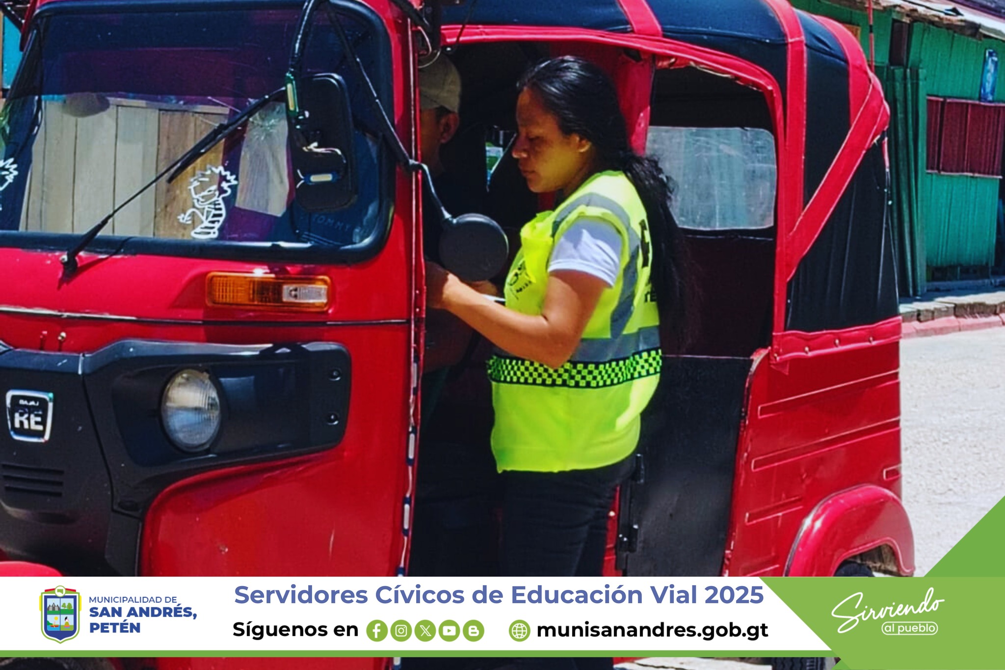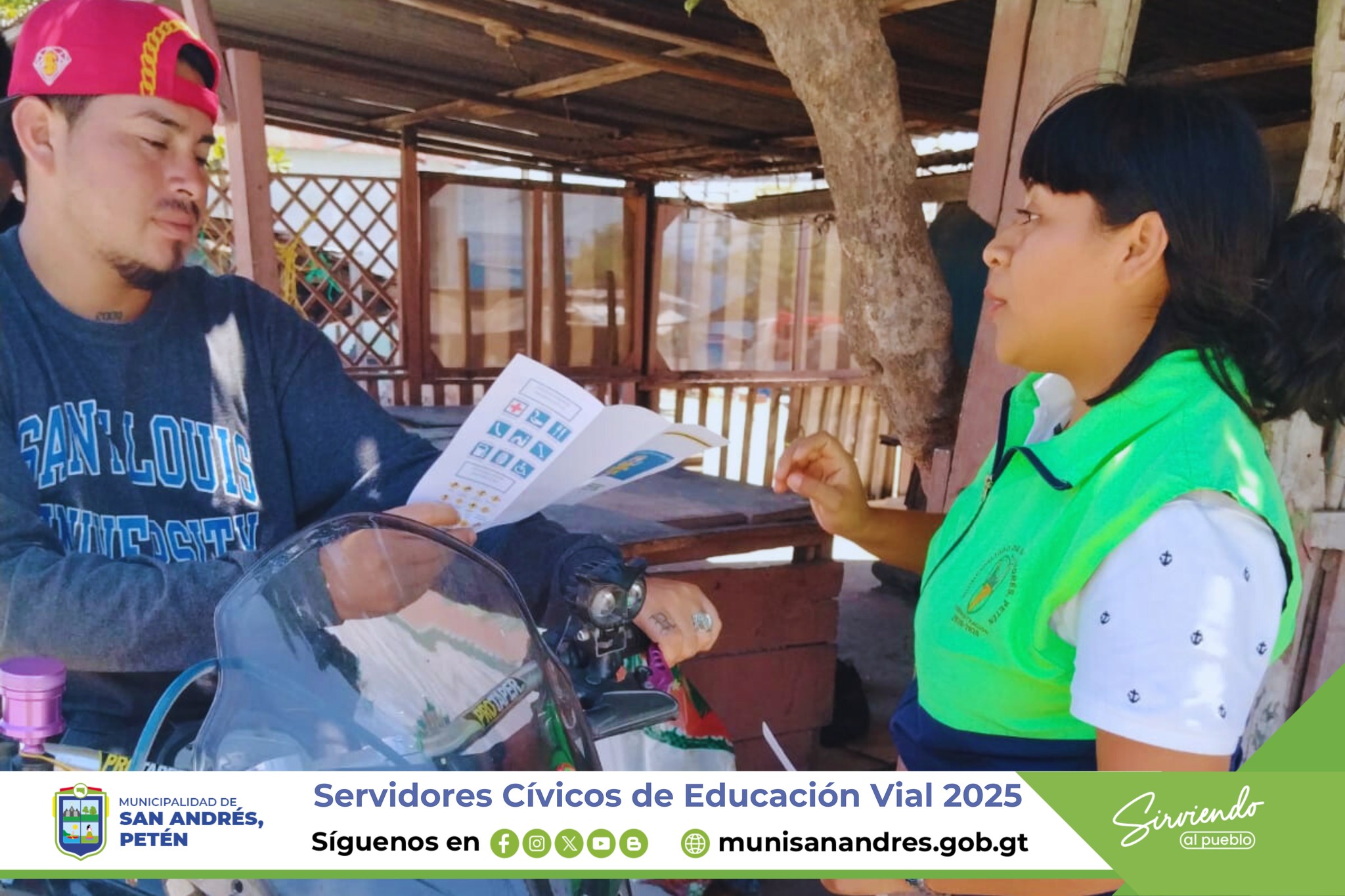 Los Servidores Cívicos de Educación Vial 2025 en San Andrés, Petén, realizan entrega de trifoliares informativos sobre concientización, de educación Vial a conductores y peatones del área central.