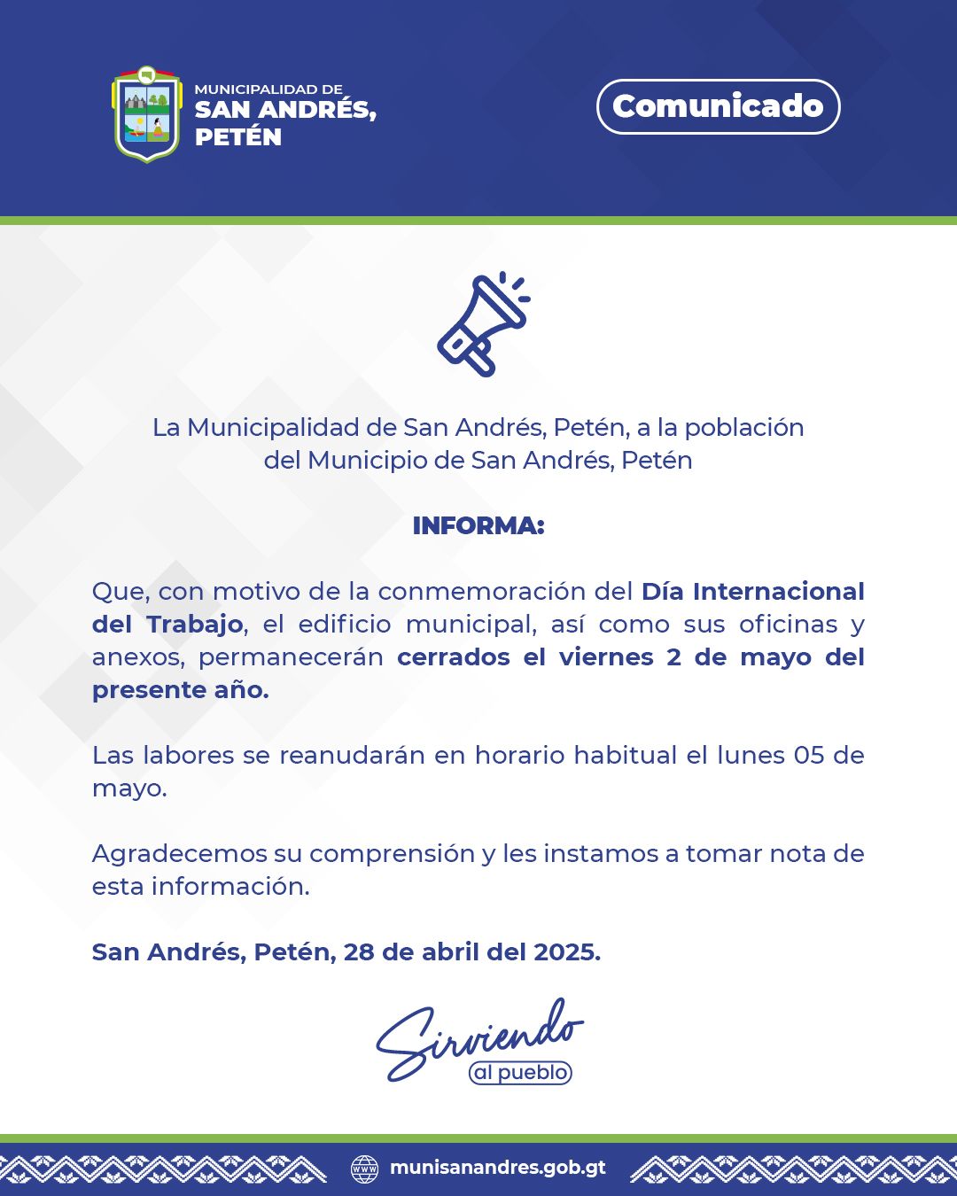 Las oficinas Municipales permanecerán cerradas el día viernes 2 de mayo retomando labores en los horarios, respectivos el día lunes 5 de mayo.
