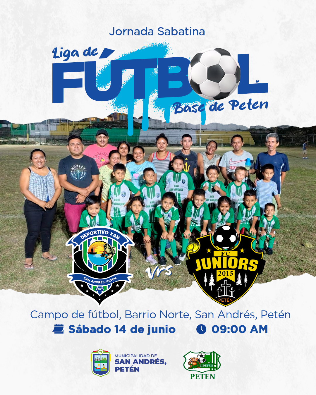 El Sr. Alcalde y Honorable Concejo Municipal de San Andrés, Petén, tienen el honor de invitar cordialmente a toda la población a disfrutar de la emocionante Jornada Sabatina de la Liga de Fútbol Base de Petén.