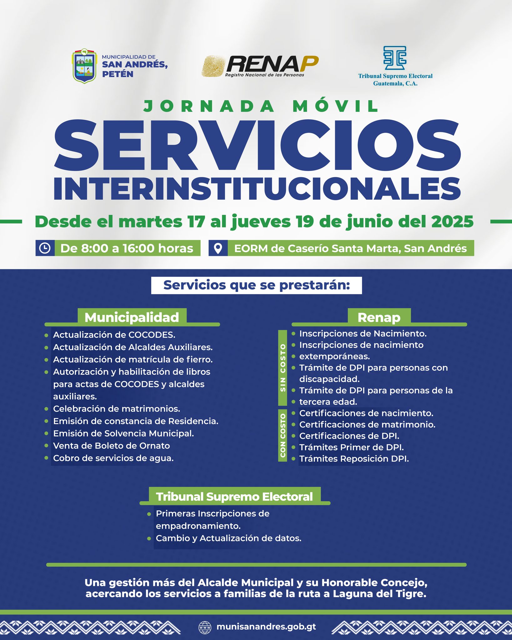 El Señor Alcalde y Honorable Concejo Municipal de San Andrés, Petén, tienen el honor de invitar a todas las familias del Caserío Santa Marta y comunidades de la ruta para aprovechar esta jornada que estará disponible: