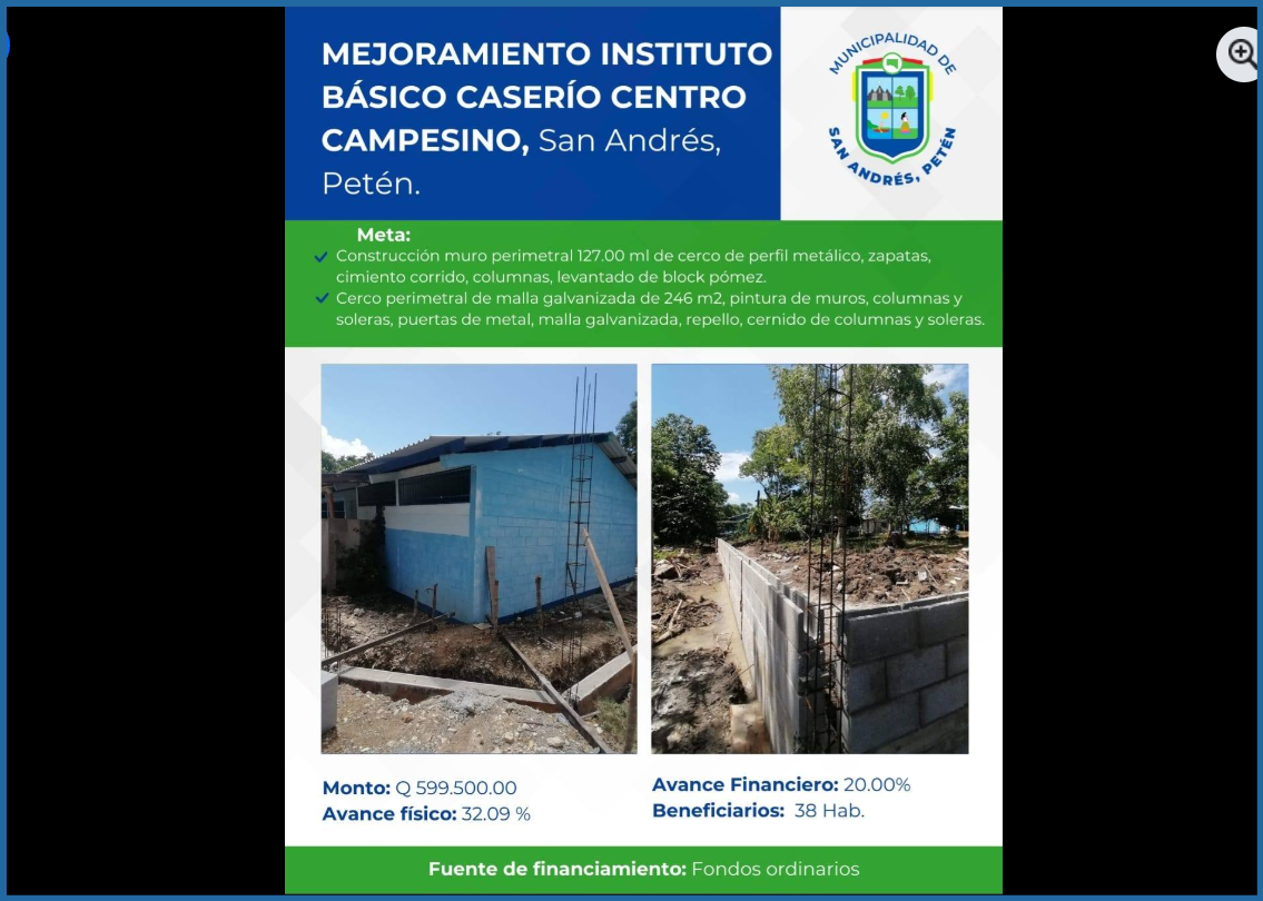 El señor alcalde municipal, junto al honorable Concejo, informan a la población en general sobre los avances del proyecto de Mejoramiento del Instituto Básico Caserío Centro Campesino, el cual contempla: