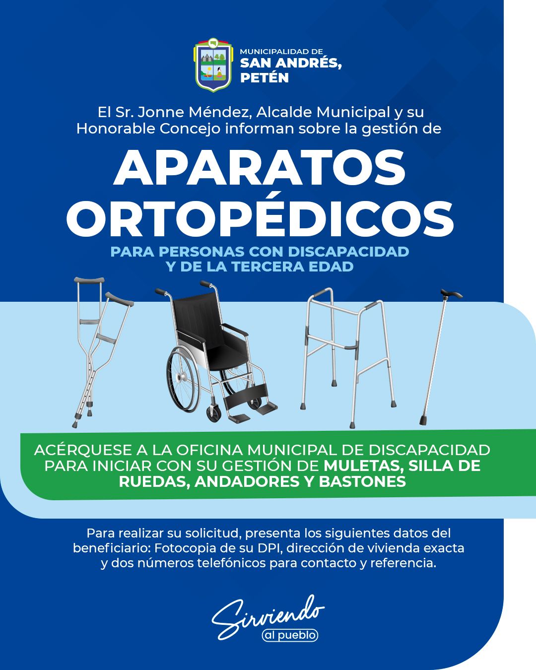 El Sr. Alcalde y el Honorable Concejo Municipal informan a las personas con discapacidad física y de la tercera edad del municipio de San Andrés, Petén, y sus comunidades que pueden aplicar para la gestión de los siguientes aparatos ortopédicos: